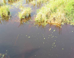 然后池塘里开始进换水。由于稻田里残留有稻梗杆,泡过一段时间后,水体很容易出现红黑水。